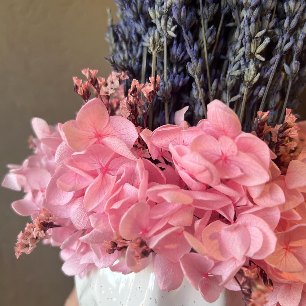 лаванда стабилизированная пучок – 1 шт.гортензия стабилизированная – 1 шт.Лимониум – 3 шт.Керамическое кашпо – 1 шт.