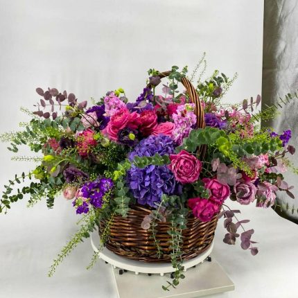 Цветы в большой коробке: садовые розы, лизиантус, маттиола, тюльпаны