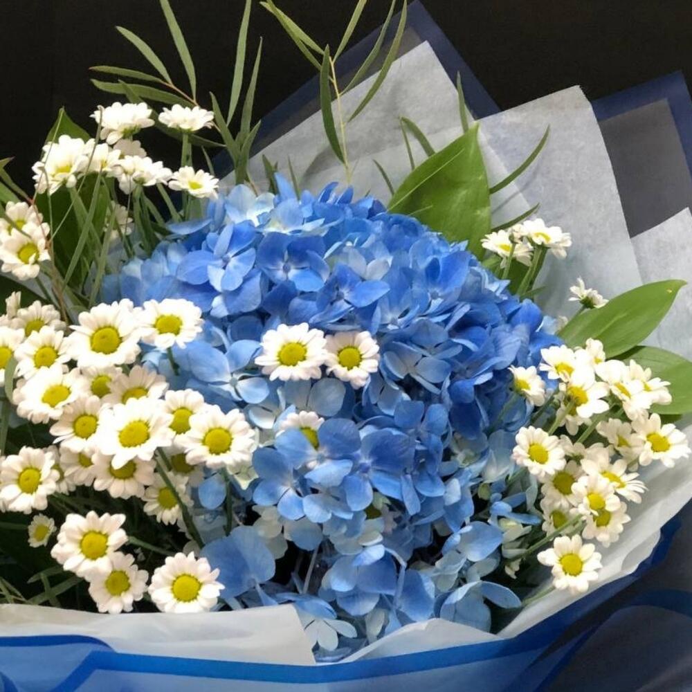 Гортензия – 1 шт.Ромашка кустовая – 3 шт.эвкалипта – 2 шт.Рускус – 6 шт.Упаковка дизайнерская – 1 шт.Лента атласная – 1 шт.