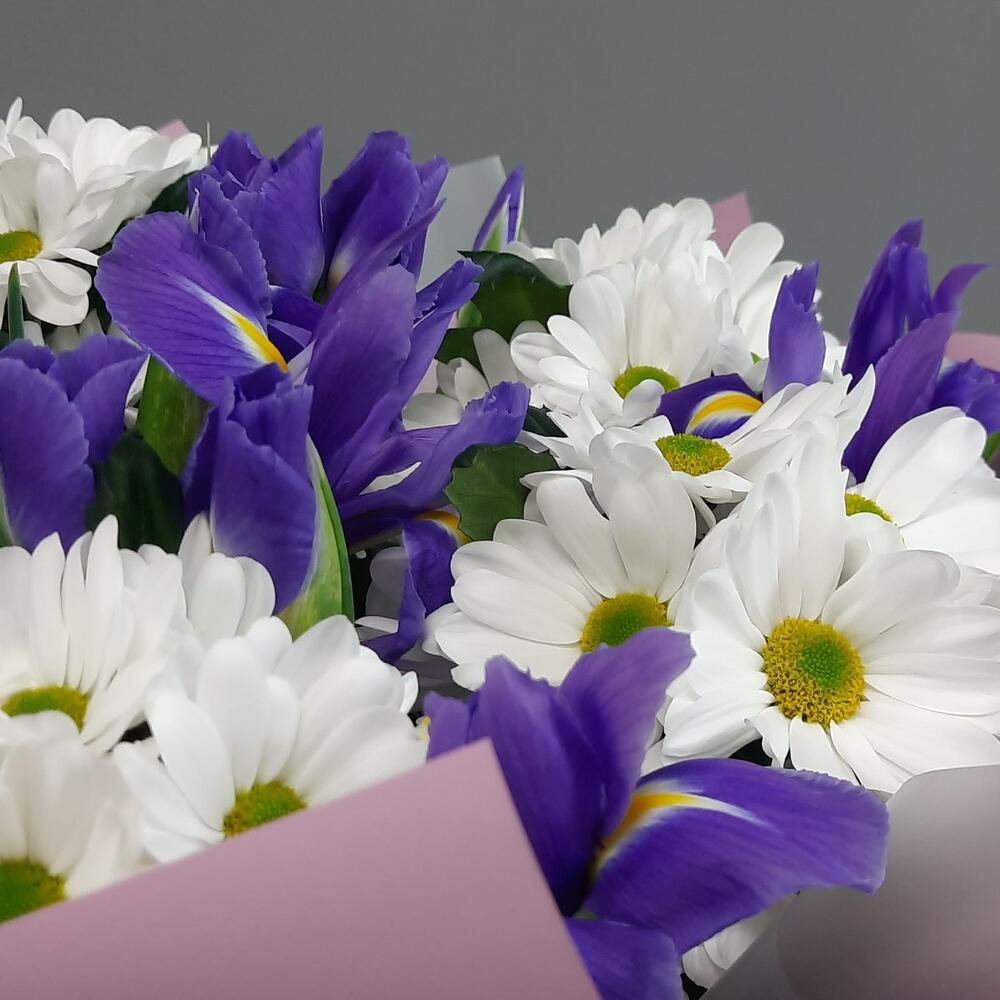 Хризантема кустовая ромашковая – 5 шт.Ирис Blue Magic – 11 шт.Упаковка дизайнерская – 2 шт.