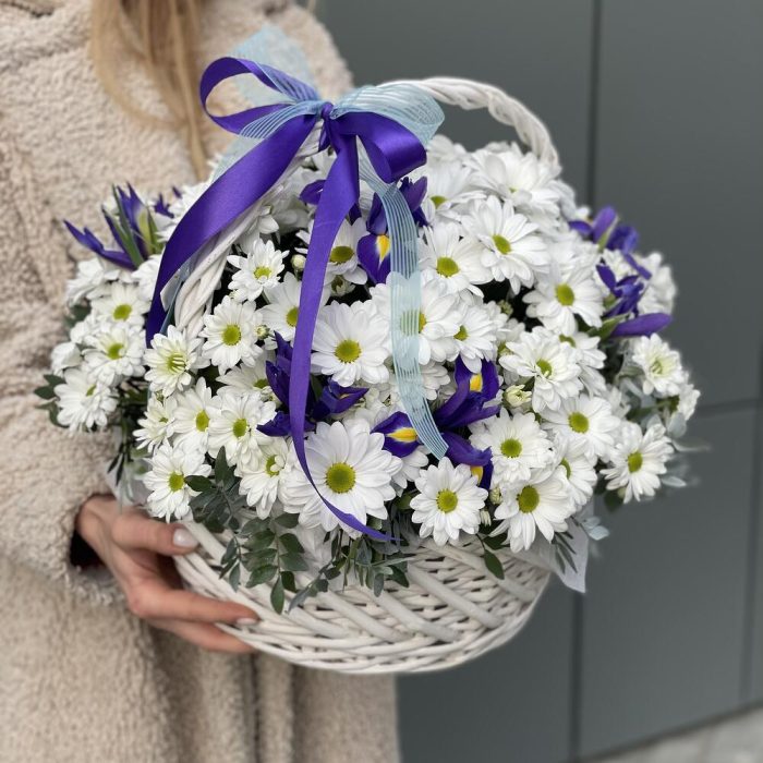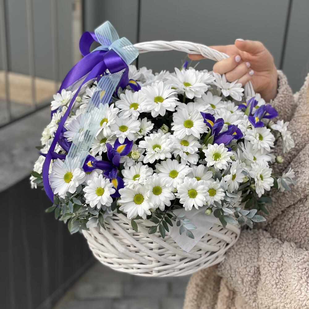 Хризантема – 11 шт. ирисы – 9 шт. Писташ – 6 шт. Корзина – 1 шт. Оазис – 2 шт. Оформление – 1 шт.