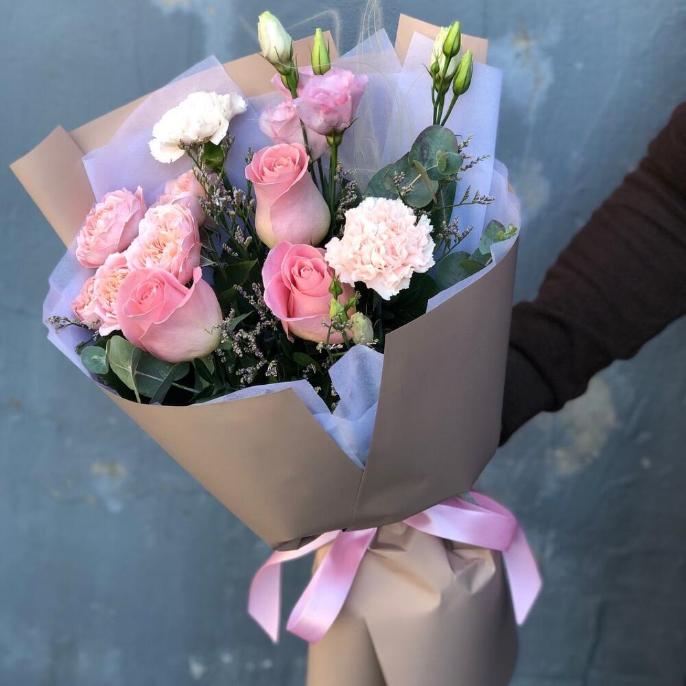 Гвоздики, Лизиантусы, Розы, Тюльпаны